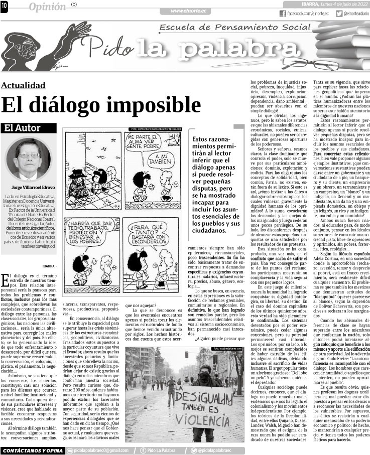 Estos razonamientos permitirán al lector inferir que el diálogo apenas si puede resolver pequeñas disputas, pero se ha mostrado incapaz para incluir los asuntos esenciales de los pueblos y sus ciudadanos. Para concretar estas reflexiones, bien vale proponer algunos ejemplos ilustrativos. ¿qué conversaciones sustantivas pueden darse entre un gobernante y un ciudadano de a pie, un banquero y su cliente, un empresario y un obrero, un terrateniente y un campesino, un “blanco” y un indígena, un General y un manifestante, una dama y una empleada doméstica, un obispo y un feligrés, un rico y un indigente, una rubia y un montubio?