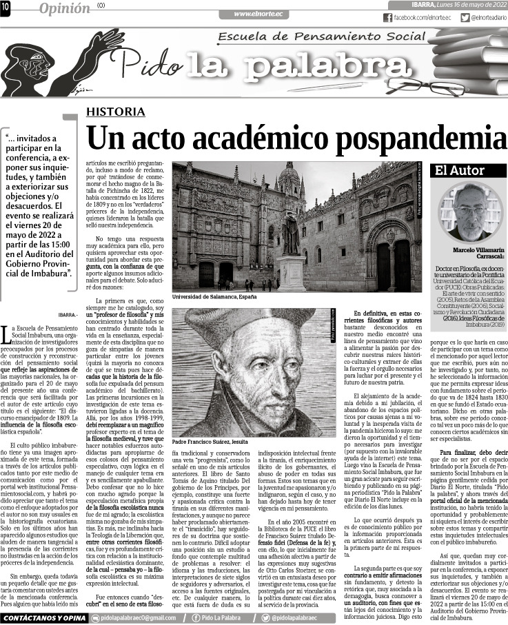 La Escuela de Pensamiento Social Imbabura, una organización de investigadores preocupados por los procesos de construcción y reconstrucción del pensamiento social que refleje las aspiraciones de las mayorías nacionales, ha organizado para el 20 de mayo del presente año una conferencia que será facilitada por el autor de este artículo cuyo título es el siguiente: “El discurso emancipador de 1809. La influencia de la filosofía escolástica española”.